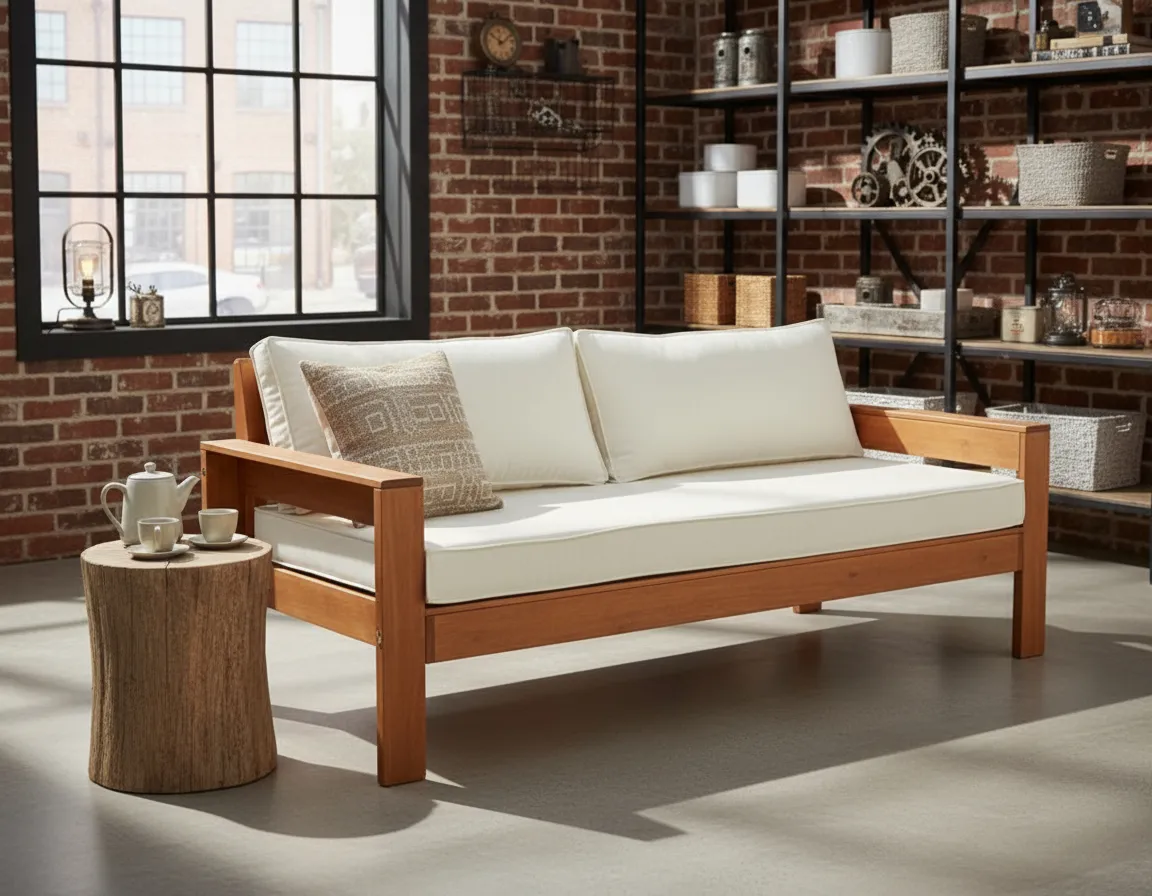 O Kit Sofá-Cama Penafort une o charme do design rústico com a resistência da madeira maciça.
