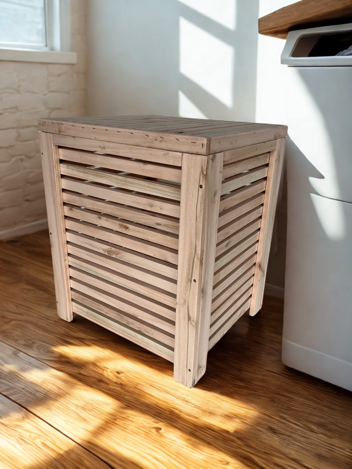 Organize seu espaço com estilo e praticidade! Nosso cesto de roupas é feito em madeira de eucalipto de alta qualidade, sem pintura, preservando a beleza natural da madeira.